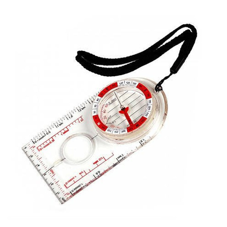 Posiada fluorescencyjny obrotowy pierścień, pływającą igłę, fluorescencyjne punkty ułatwiające ustawienie azymutu, podziałki z linijką i skalą oraz szkło powiększające na płytce.