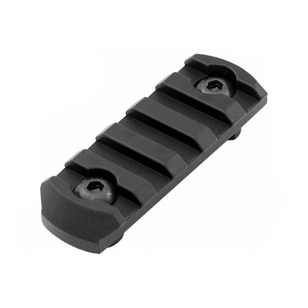 Szyna Picatinny / RIS z montażem M-LOK. Długości 2 3/8'' i 5 slotami. Wykonana z aluminium 6061 zabezpieczonego pokryciem Typu 3. Mocowana na dwie śruby z nakrętkami, dołączone do zestawu. Dostosowana do wytrzymywania odrzutu i wstrząsów.
