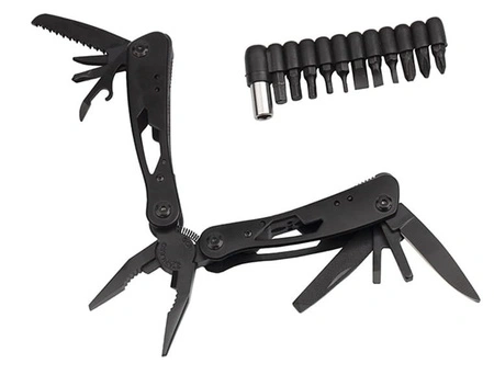 Konstrukcja mieści w sobie m.in. kombinerki, nóż, otwieracze, śrubokręty oraz inne narzędzia widoczne na zdjęciach - razem