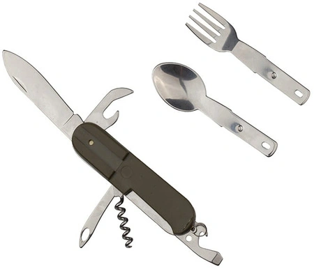 Niezbędnik Legii Cudzoziemskiej zawiera: nóż, widelec, łyżka, otwieracz do puszek, otwieracz do butelek, korkociąg, dłutko, śrubokręt płaski.