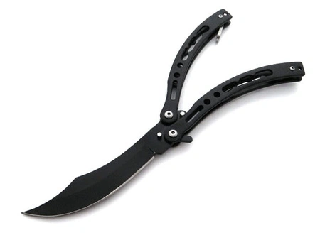 Efektownie wyglądający, czarny nóż motylkowy o falistym kształcie.