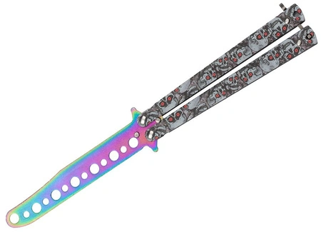 Klasyczna dla balisongów rękojeść składa się z dwóch, aluminiowych okładzin z nadrukiem przedstawiającym czaszki.