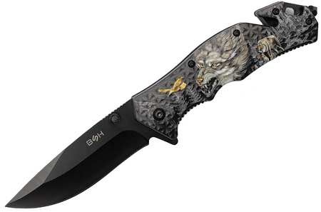 NÓŻ RATOWNICZY BSH ADVENTURE Z WIZERUNKIEM WILKA NA RĘKOJEŚCI N-353D