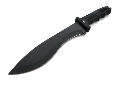 Potężny, czarny nóż taktyczny którego kształt wzorowany jest na tradycyjnych maczetach kukri.