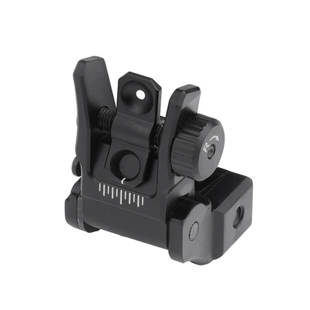 Wykonany z trwałego aluminium lotniczego celownik przeziernikowy dedykowany do karabinków AR15. Przeznaczony do montażu na szynach Picatinny. Lekka i niezawodna składana konstrukcja ze sprężynowym otwarciem. Posiada nastawę do strzelania na krótkie i średnie odległości. Jest kompatybilny z niskoprofilowymi muszkami, celownikami kolimatorowymi i optyką, a sprężynowy przycisk zapewnia szybkie otwieranie oraz pewną blokadę w złożonej pozycji.