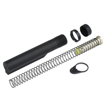 Zestaw 6-pozycyjnej prowadnicy kolby kompatybilnej z karabinkami AR15 w standardzie Mil-Spec. Wykonana z trwałego aluminium 6061-T6. Konstrukcja prowadnicy umożliwia precyzyjną regulację długości. Do zestawu producent dołącza sprężynę, urządzenie powrotne oraz tylną płytkę i nakrętkę prowadnicy kolby.