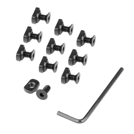 Zestaw 10 stalowych śrub i nakrętek w standardzie M-LOK. Dołączono klucz imbusowy.